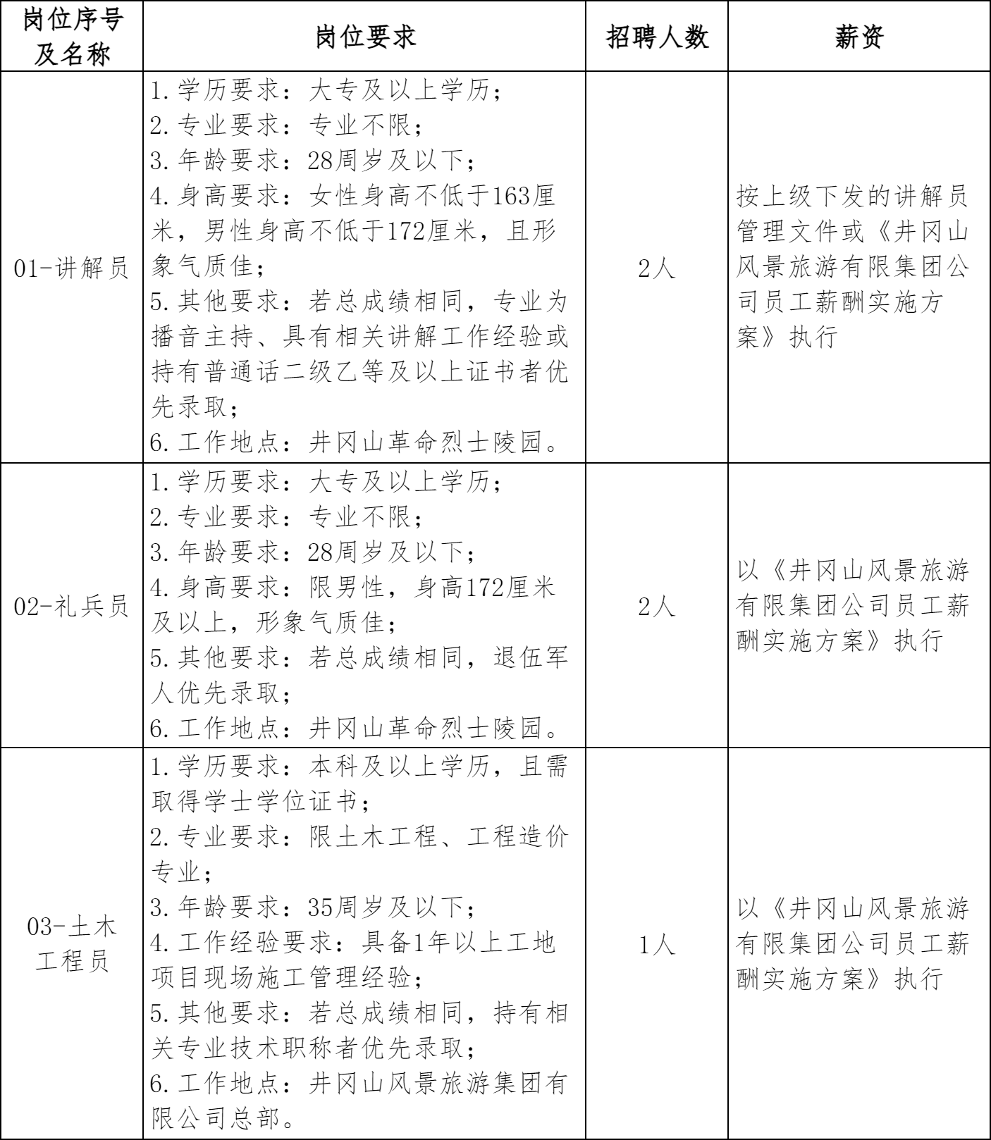 详见附件1《2026年井冈山风景旅游集团有限公司招聘岗位及任职要求》。本次招考年龄计算方法为:28周岁及以下是指1998年3月31日(含)以后出生,其他年龄要求以此类推。招聘岗位要求的学历、工作经历的计算截止时间为3月31日。